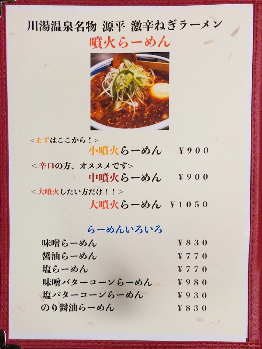 川湯温泉名物・源平の激辛ねぎラーメン。辛さは3段階、まずはこの小噴火ラーメンからお試し下さい。川湯温泉のように体が温まります。/Kawayu Onsen's specialty, Genpei's spicy green onion ramen noodle with 3 levels of spiciness. Try this small eruption ramen first if you've never had it before. It warms up your body like Kawayu Onsen (hot spring.)