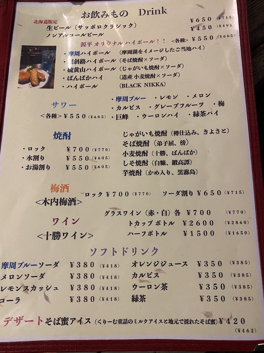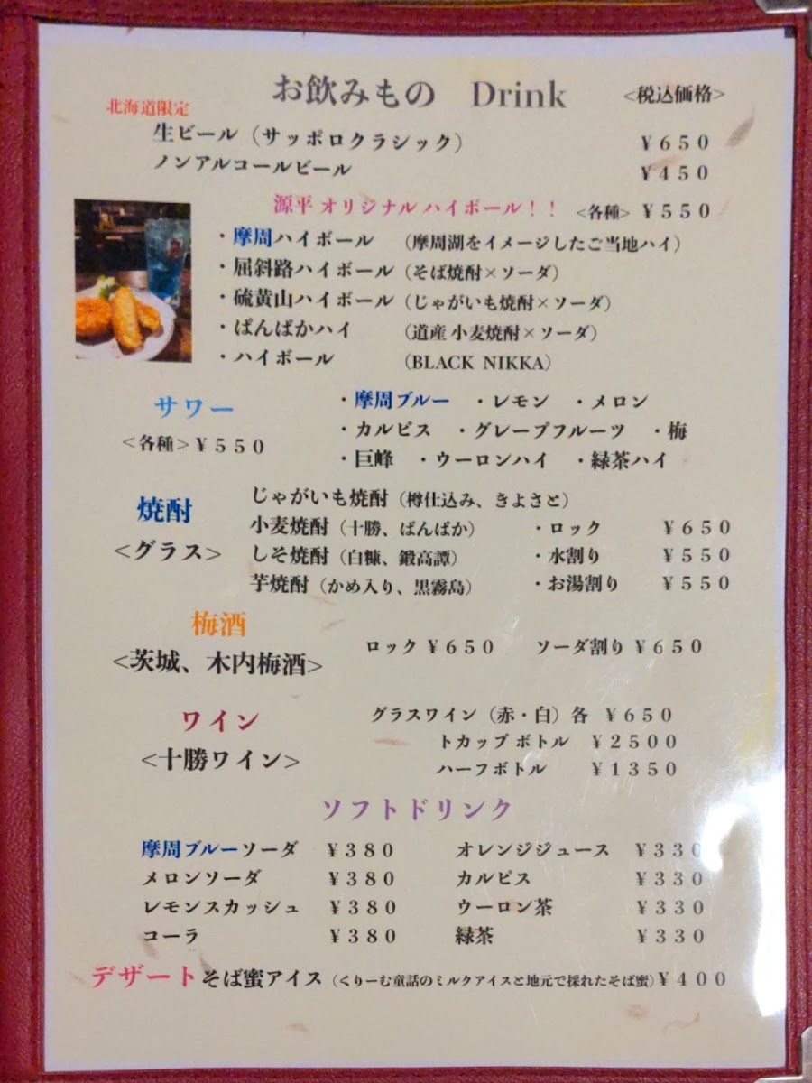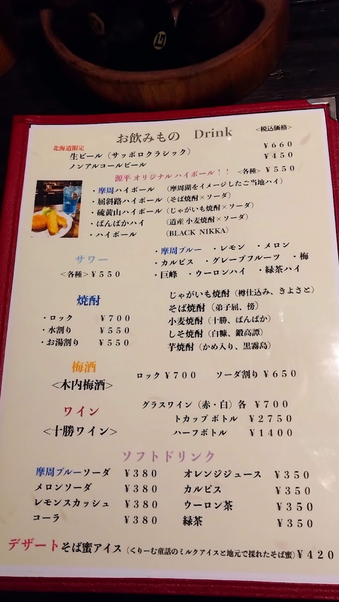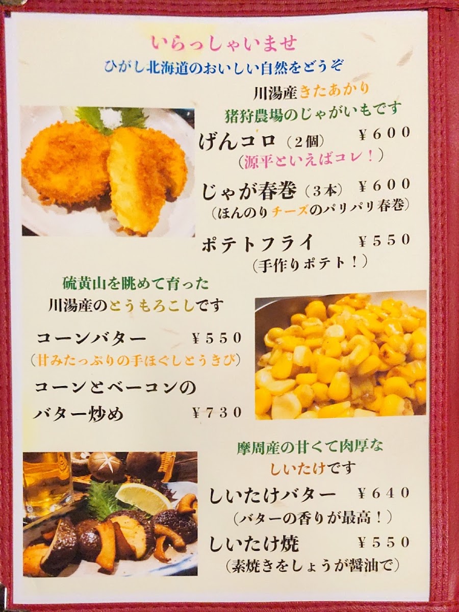 Inaka-Ya Genpei offers a delightful and diverse dinner menu, with dishes that reflect the region’s unique flavors. Start your meal with the Genkoro (2 pcs), a savory appetizer priced at ¥xxx, or indulge in the rich, buttery taste of Shiitake Butter, featuring perfectly sautéed shiitake mushrooms. For a more adventurous option, the Tsubu Yaki (Grilled Whelk Shell) is a must-try, offering a tender yet flavorful experience. When it comes to main dishes, the Sho Funka Ramen (Small Eruption Ramen Noodle) brings a spicy, bold twist, perfect for ramen lovers. To complement the meal, enjoy a refreshing Mashu Highball (Mashu Whisky and Soda), which pairs wonderfully with the dishes. Whether you're craving something light or a heartier meal, Inaka-Ya Genpei’s menu delivers an array of options that cater to various tastes and preferences.